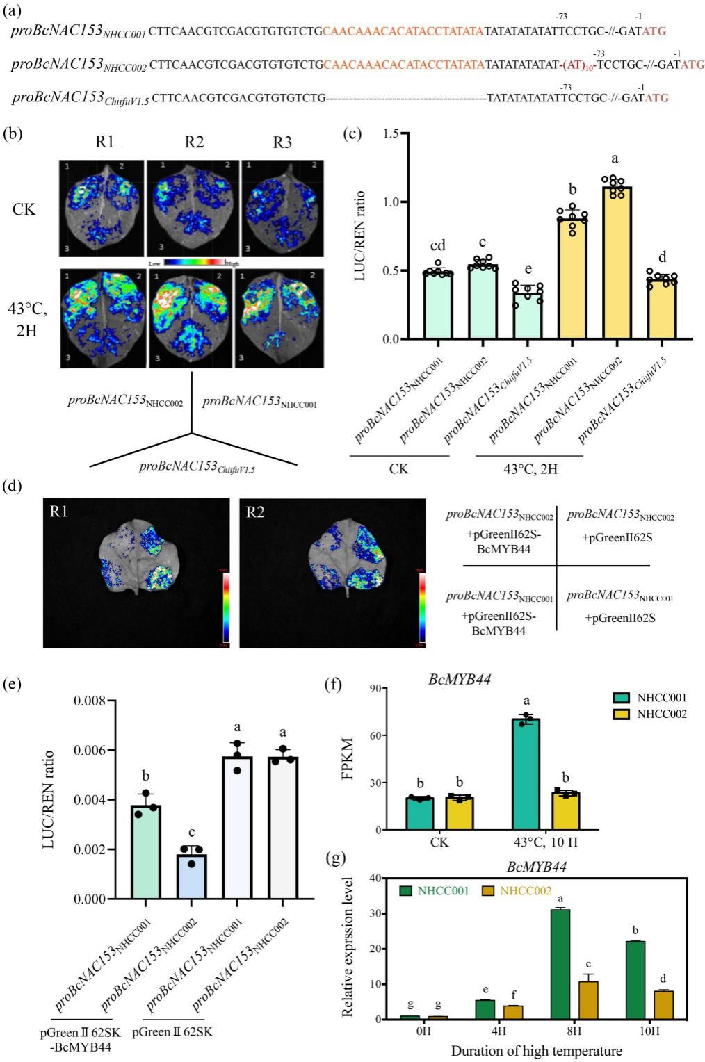 通过在拟南芥和不结球白菜中进行过表达及瞬时转化实验,研究者证实BcNAC153的过表达导致植株高温耐受性显著下降,电解质渗漏率升高,表明BcNAC153是高温耐受性的负调控因子。进一步对BcNAC153启动子序列进行分析,发现耐热与敏感材料之间存在(AT)n插入变异,其中耐热材料中(AT)n插入数量较少(6-8个),而敏感材料中则较多(18-26个)。启动子活性分析表明,该(AT)n插入序列是高温响应所必需的关键顺式元件。通过酵母单杂交文库筛选及双荧光素酶报告实验,研究鉴定出转录因子BcMYB44可直接结合BcNAC153启动子并抑制其转录活性,且BcMYB44在耐热材料中的表达水平显著高于敏感材料,与BcNAC153的表达呈现相反趋势。