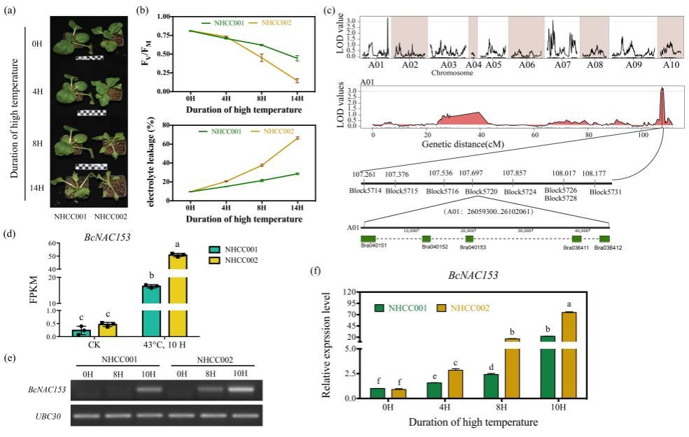 以高温耐受型自交系NHCC001和高温敏感型自交系NHCC002为亲本,构建了包含312个单株的F₂分离群体,并利用全基因组重测序技术构建了一张包含3608个bin标记的高密度遗传图谱,总图距为1156.88 cM,平均相邻标记间距仅为0.32 cM。基于该图谱,研究者在A01染色体上定位到一个主效QTL,可解释6.101%的表型变异。进一步通过转录组数据分析,筛选获得了一个响应高温胁迫的NAC转录因子家族基因,命名为BcNAC153。该基因在高温敏感材料NHCC002中的表达水平显著高于耐热材料NHCC001,提示其可能作为负调控因子参与高温耐受性调控。