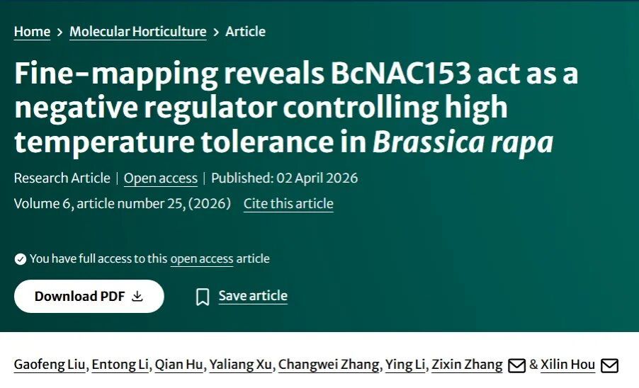 大学侯喜林教授团队题为“Fine-mapping revealsBcNAC153act as a negative regulator controlling high temperature tolerance inBrassica rapa”的研究论文。该研究通过构建高密度遗传图谱,成功鉴定到一个调控不结球白菜高温耐受性的关键负调控因子BcNAC153,并系统解析了其在高温胁迫响应中的作用机制,为耐热蔬菜品种的分子育种提供了新靶点。