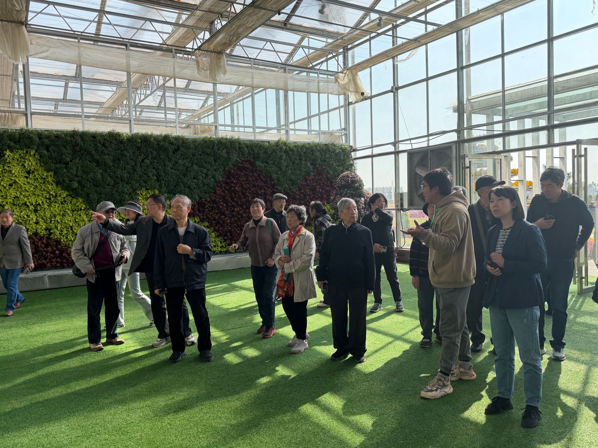 深秋时节,菊博园内千姿百态的菊花竞相绽放,老同志们精神矍铄,漫步于花海之间,时而驻足欣赏,时而拍照留念,对菊花丰富的品种、新颖的造型和先进的栽培技术赞不绝口。他们不仅是赏花的游客,更是行业的专家。在参观过程中,老同志们结合自己毕生所学的园艺专业知识,与园区技术人员就菊花的新品种选育、病虫害绿色防控、景观应用及深加工产业等内容进行了深入交流和探讨,提出了许多宝贵的建议,现场气氛热烈,其乐融融。